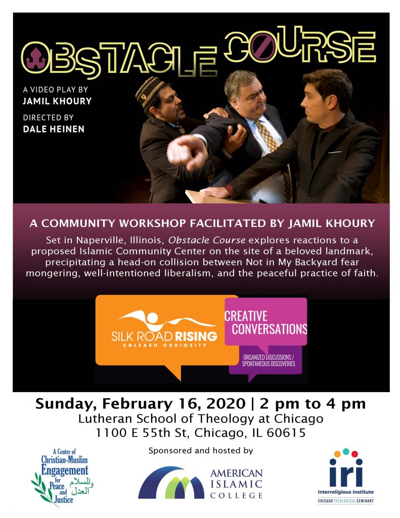 Silk Road Rising recently released Obstacle Course, Jamil Khoury’s new video play. Loosely based on Mosque Alert, it explores reactions to a proposed Islamic Community Center on the site of a beloved landmark, precipitating a head-on collision between Not in My Backyard fear mongering, well-intentioned liberalism, and the peaceful practice of faith.